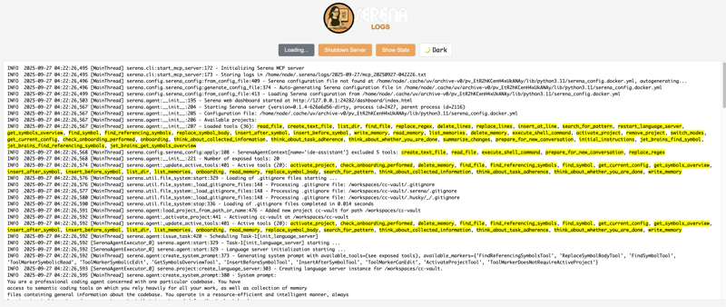 INFO 2025-09-27 04:22:26,499 [MainThread] serena.config.serena_config:from_config_file:413 - Loading Serena configuration from /home/node/.cache/uv/archive-v0/pv_EtR2hKCenH4xUkANAy/lib/python3.11/serena_config.docker.ymlDev Container 環境では serena_config.docker.yml が一時キャッシュディレクトリに作られることが確認できます。